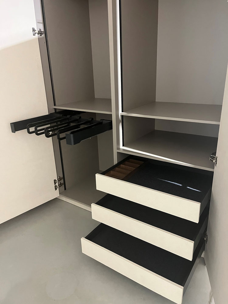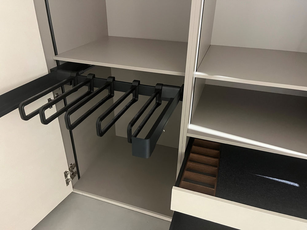 Hochschränke mit Hosenauszug, Kleiderlift, Kleinteilaufbewahrung, Kleiderstangen und Innenauszügen.