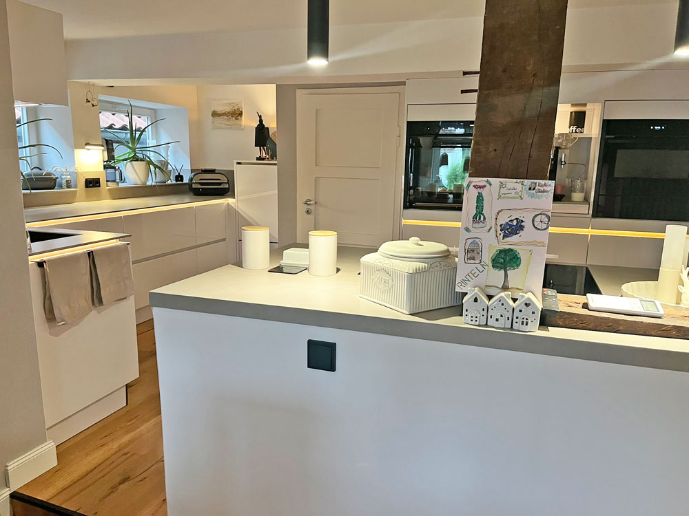 In unserem alten Haus ist keine Wand gerade, geschweige denn sie stehen im rechten Winkel. Diese Herausforderung hat das Küchencentrum Holtmann in Zusammenarbeit mit dem Steinmetz Steinformt hervorragend gemeistert. Auch nach vielen Anpassungen waren die Monteure stets gut gelaunt.