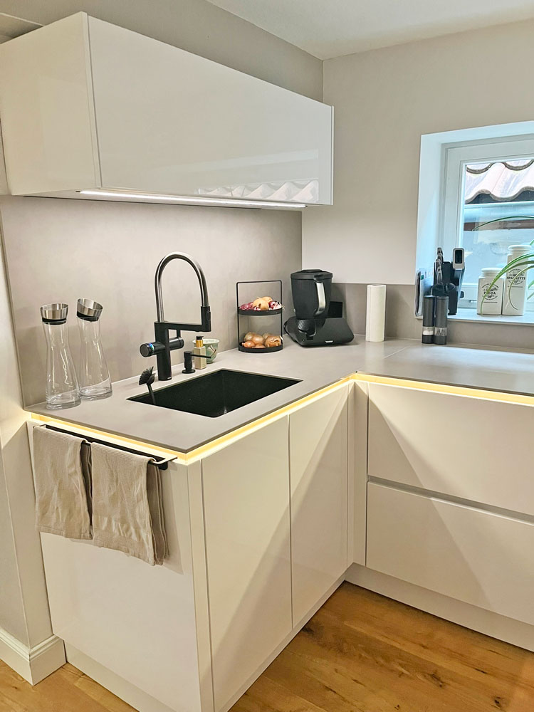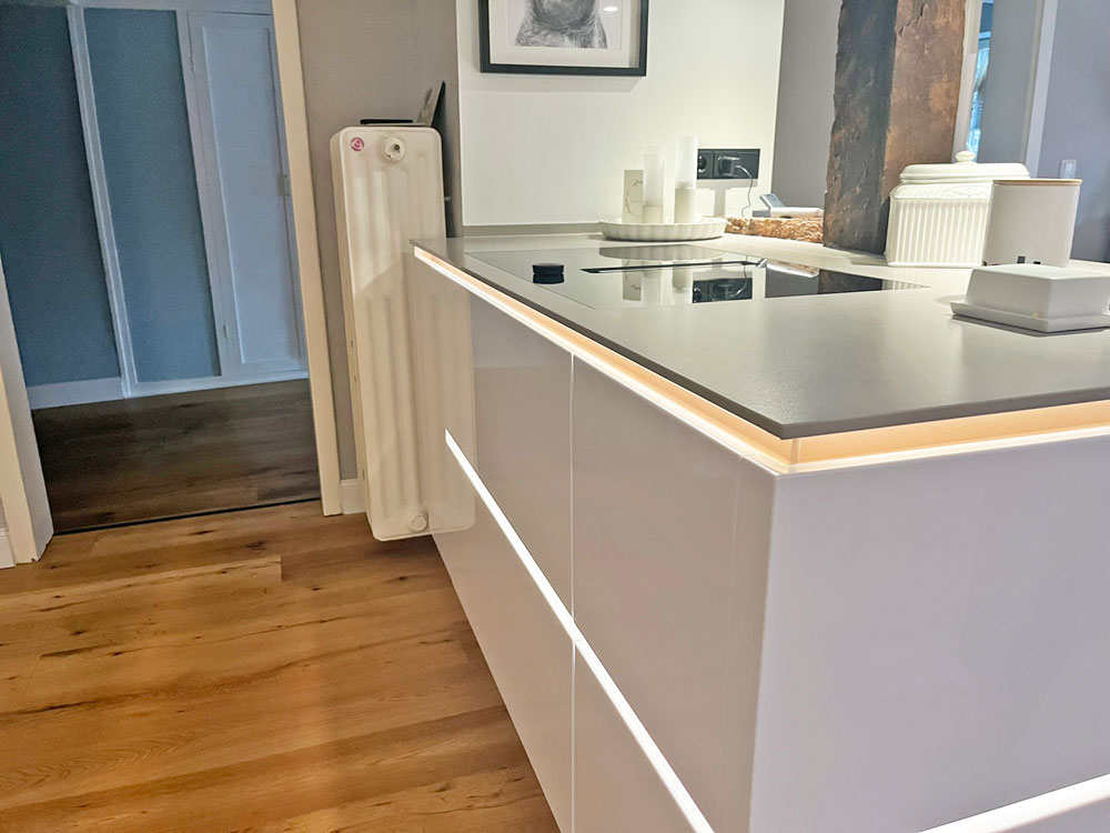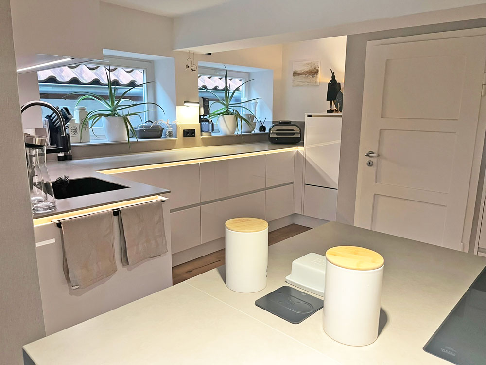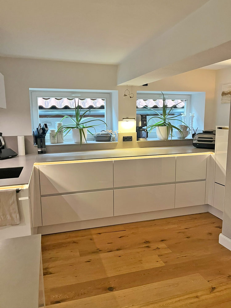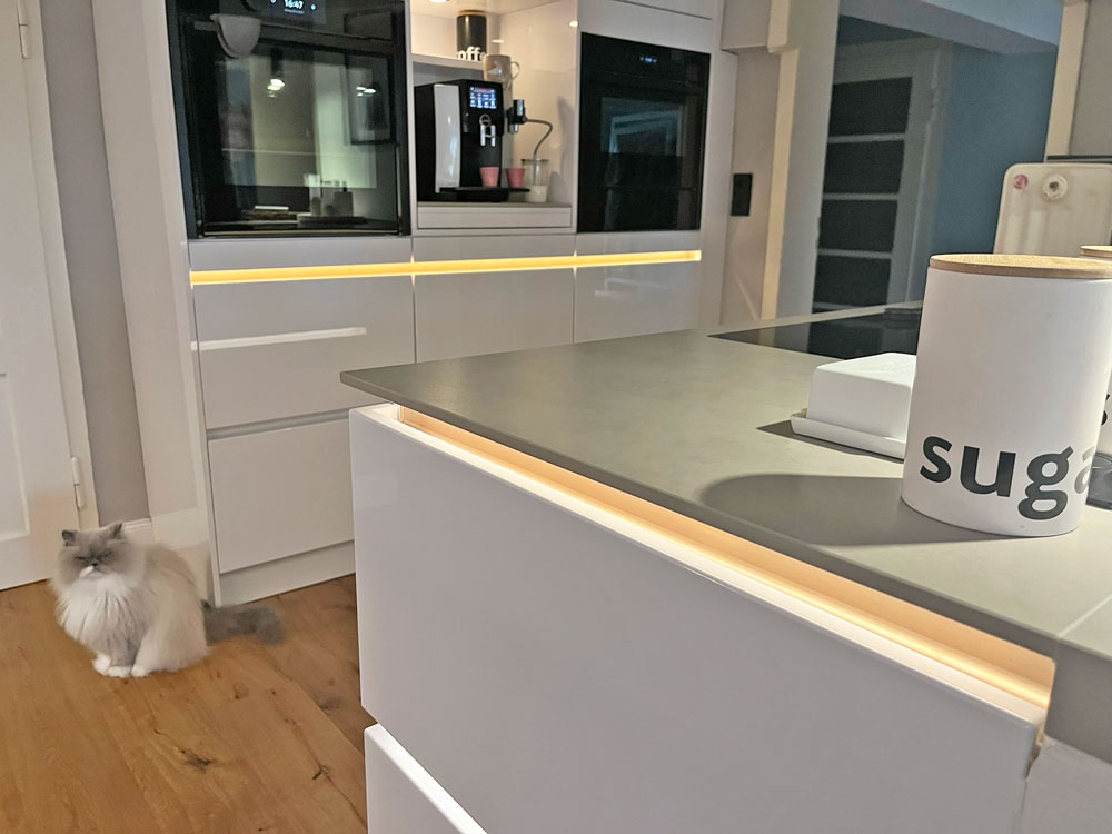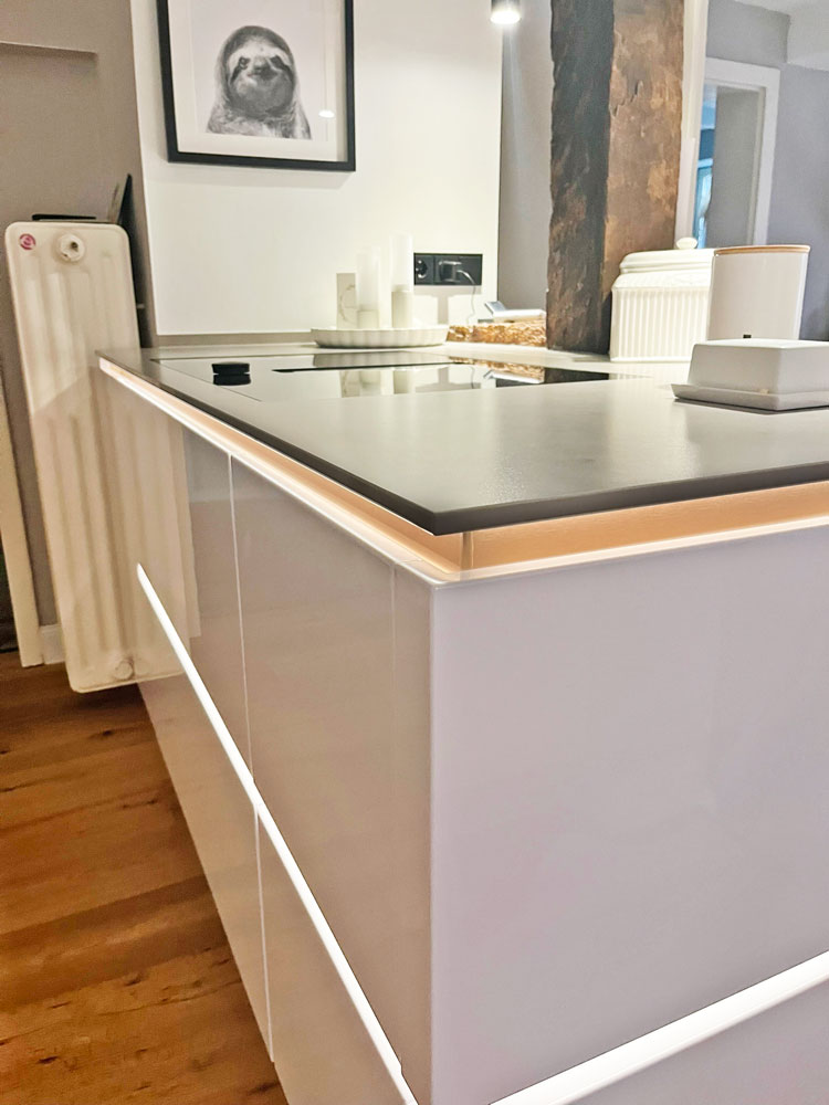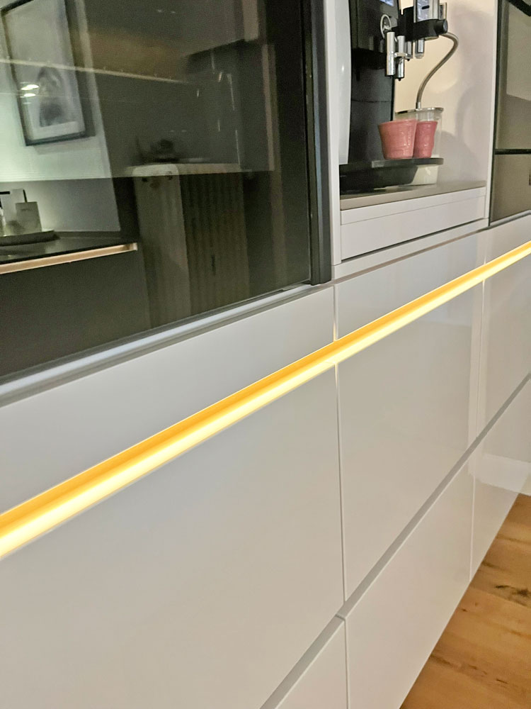 Herr Prasuhn brachte uns auf die Idee die beleuchtete Kehlleiste in Kupfer zu wählen, was das Licht ganz besonderes wohnlich macht, worauf wir alleine im Leben nicht gekommen wären. Wir können jedes Modul einzeln ansteuern und auch dimmen. Und wir haben diese Unterleuchtung der Arbeitsplatte wirklich jeden Abend an.
