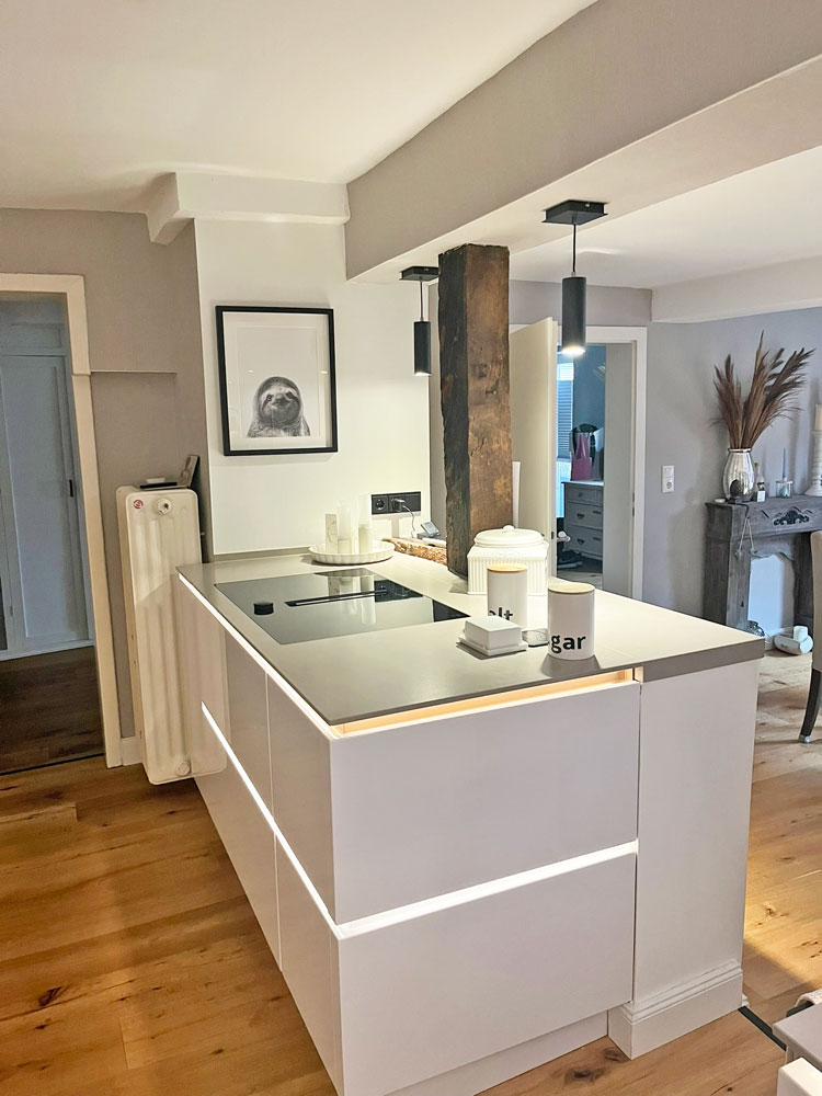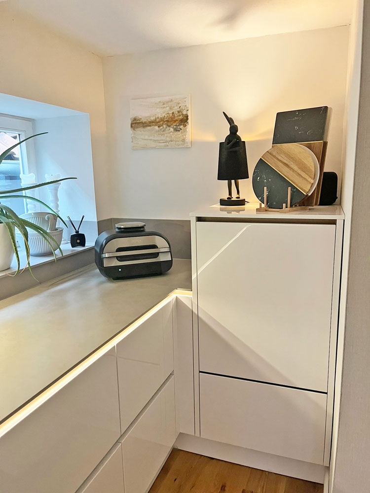 Wir hatten zwei Jahre zuvor unsere alte Küche, die buche-farben war, anthrazit gestrichen, um sie moderner wirken zu lassen. Schnell wurde klar: Die Farbe schluckte zu viel Licht und war uns einfach zu dunkel. Deshalb sind wir zu Kristallweiß gewechselt – eine Entscheidung, mit der wir mehr als zufrieden sind.