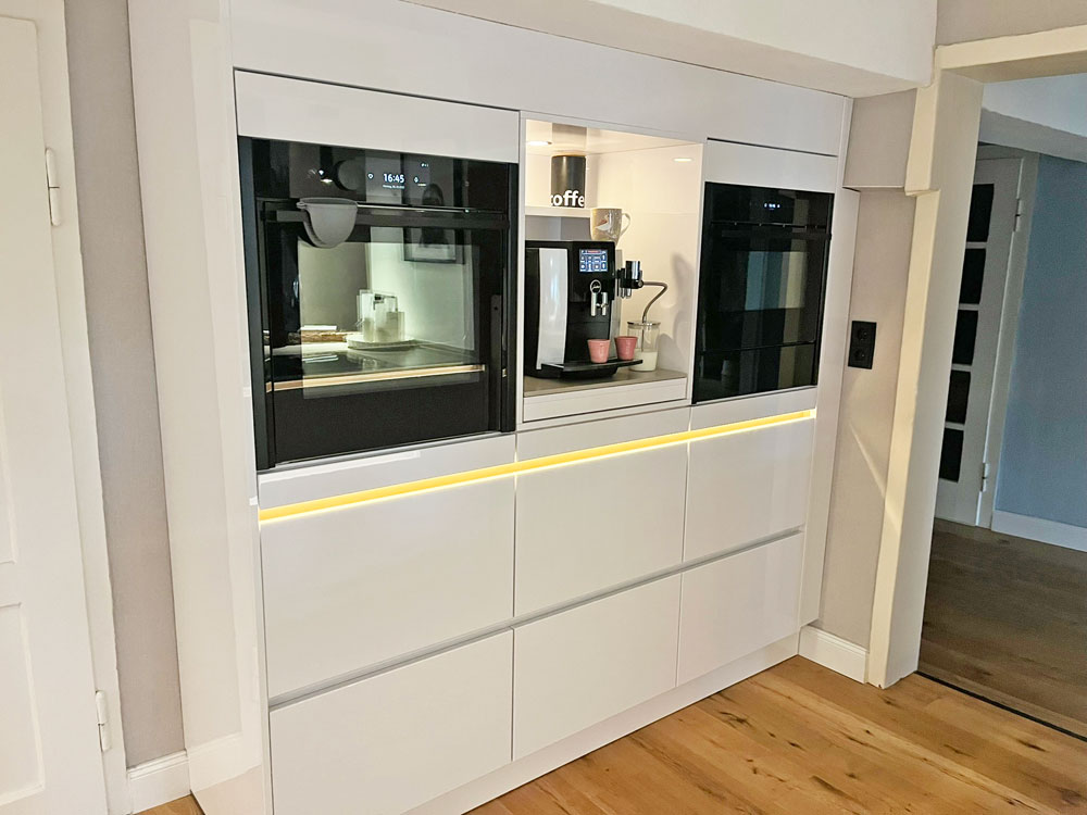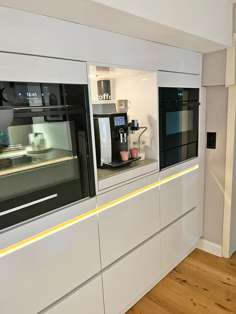 Der Slide and Hide® Backofen von NEFF und die Mikrowelle sitzen ebenfalls höher. Die versenkbare Tür ist nicht im Weg, man verbrennt sich nicht daran. Der integrierte Dampfgarer hat sich ebenfalls als sehr vorteilhaft erwiesen, das Essen gelingt gleichmäßig und das Gemüse ist wirklich sehr schmackhaft.