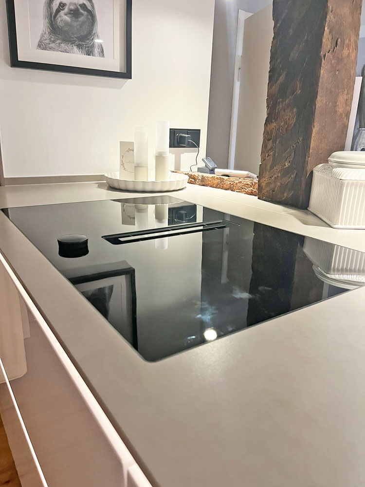 Bei der Arbeitsplatte haben wir uns für eine Neolith-Keramikarbeitsplatte entschieden. Es hat uns sofort überzeugt, da das Material hitzebeständig ist und sich sehr einfach reinigen lässt. Wir wollten eine optisch ruhige Oberfläche, was mit der Farbe „Pietra de Luna“ hervorragend passt.