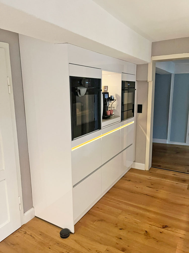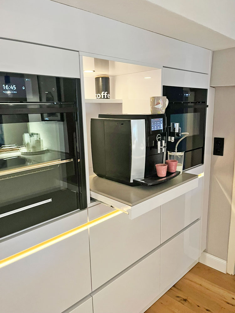 Das ausziehbare Tablar, auf dem unsere Kaffeemaschine steht, ist unglaublich praktisch. Wir haben es in der Ausstellung im Küchencentrum Holtmann gesehen und waren sofort überzeugt.