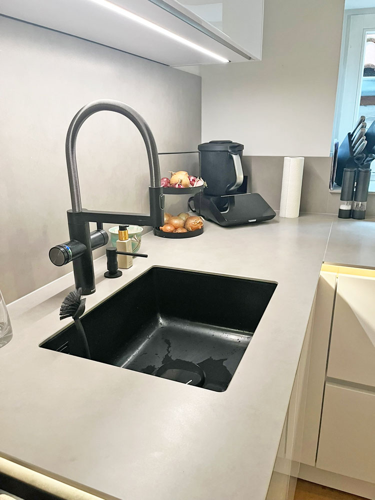 Der Wasserhahn von Blanco ist ebenfalls ein Highlight: An heißen Sommertagen ist kaltes Wasser mit oder ohne Sprudel einfach lecker. Und beim Kochen oder für eine schnelle Tasse Tee freuen wir uns über sofort verfügbares heißes Wasser. Es gibt keine Wartezeit mehr – heiß, kalt oder sprudelnd genauso, wie wir es brauchen.